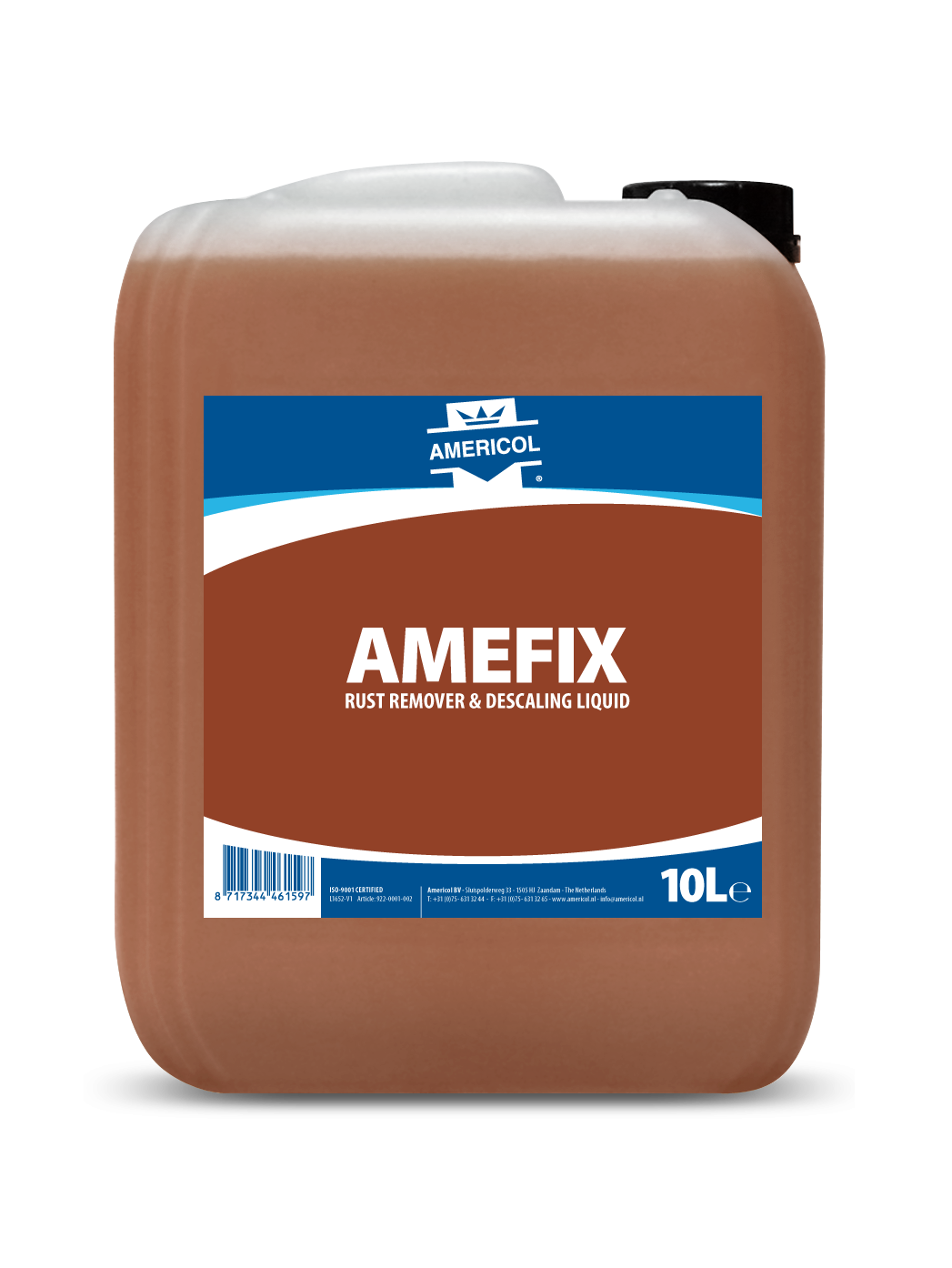 Amefix fra Americol er en kraftfull, hurtigvirkende og syrebasert rustfjerner og avkalker. Produktet er spesielt egnet for fjerning av kalk, oksidasjoner, rust, sement og veiskitt fra aluminiumsoverflater, kjøretøy, rør og fliser. Ikke egnet for rengjøring av kalkholdige steintyper (marmor). Amefix kan også brukes til å fjerne gjenstridige rustrenner i toalett.