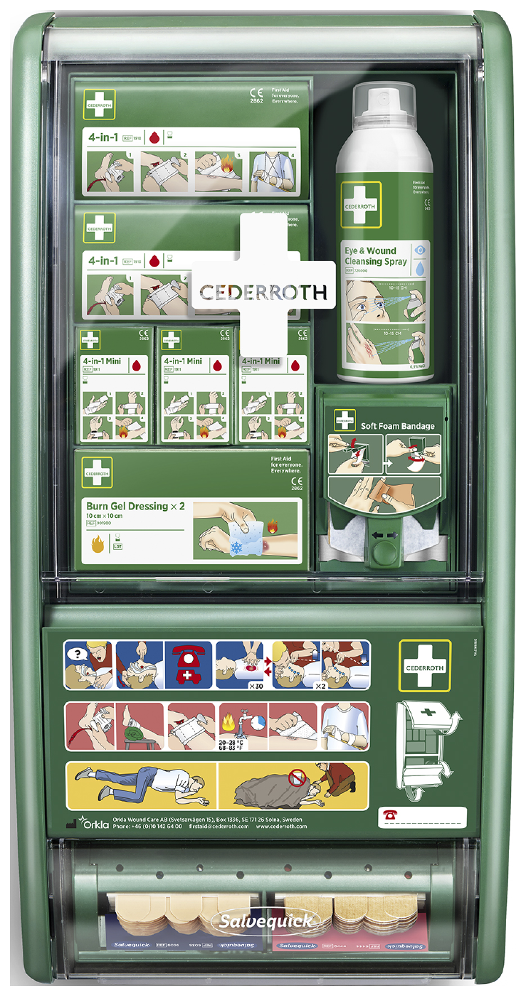 Cederroth First Aid Station inneholder produkter for å håndtere flere typer skader og kan også enkelt tilpasses ulike omsorgsbehov.