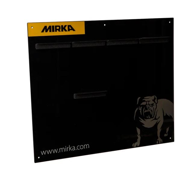 Formålet med slipeblokkplaten er å organisere alle Mirka slipeblokker på ett sted. Brettet egner seg for bruk i karosseriverksteder, treningssentre osv. En instruksjon om hvordan man monterer plaststøttene med borrelås er inkludert.