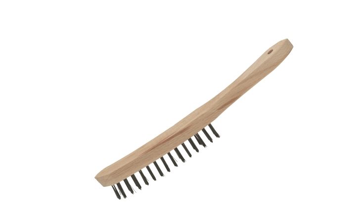 Stålbørste med trehåndtak og ståltråd Ø 0,30 – 0,35 mm. Velegnet til bl.a. rengjøring og fjerning av rust på grove overflater som tre, betong, stein og jern